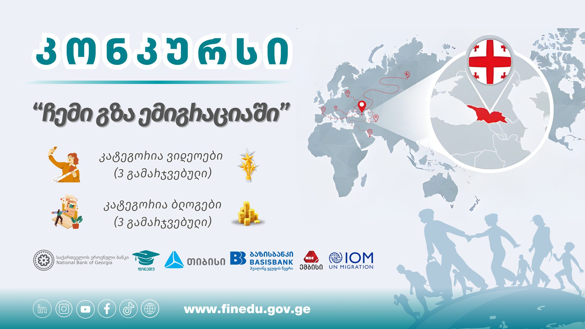 საქართველოს ეროვნული ბანკი და მისი ფინანსური განათლების პლატფორმა - www.finedu.gov.ge მხარდამჭერ ორგანიზაციებთან: სს „თიბისი ბანკთან“, სს „ბაზისბანკთან“, სს „ემბისისთან“ და მიგრაციის საერთაშორისო ორგანიზაციასთან (IOM) ერთად აცხადებს ბლოგების და ვიდეოების კონკურს, სახელწოდებით „ჩემი გზა ემიგრაციაში”.
