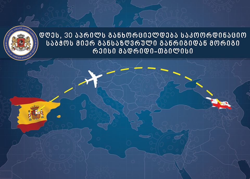 საქართველოს ხელისუფლება განაგრძობს უცხოეთში მყოფი მოქალაქეების სამშობლოში ეტაპობრივად და ორგანიზებულად დაბრუნების პროცესს. უწყებათაშორისი საკოორდინაციო საბჭოს მიერ განსაზღვრული ავიარეისების ფარგლებში, დღეს, 30 აპრილს,შესრულდება ჩარტერული რეისი მადრიდიდან თბილისის მიმართულებით, რომლითაც სამშობლოში დაბრუნდება საქართველოს 180 მოქალაქე.