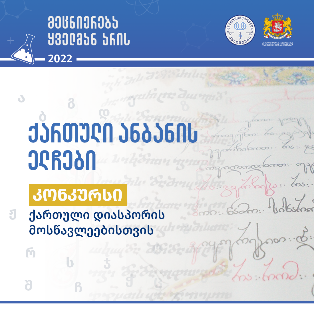 საქართველოს განათლებისა და მეცნიერების სამინისტროს მეცნიერების პოპულარიზაციის პროგრამის ფარგლებში თსუ არნოლდ ჩიქობავას სახელობის ენათმეცნიერების ინსტიტუტი ქართული დიასპორის მოსწავლეებისათვის აცხადებს კონკურსს – „ქართული ანბანის ელჩები“.