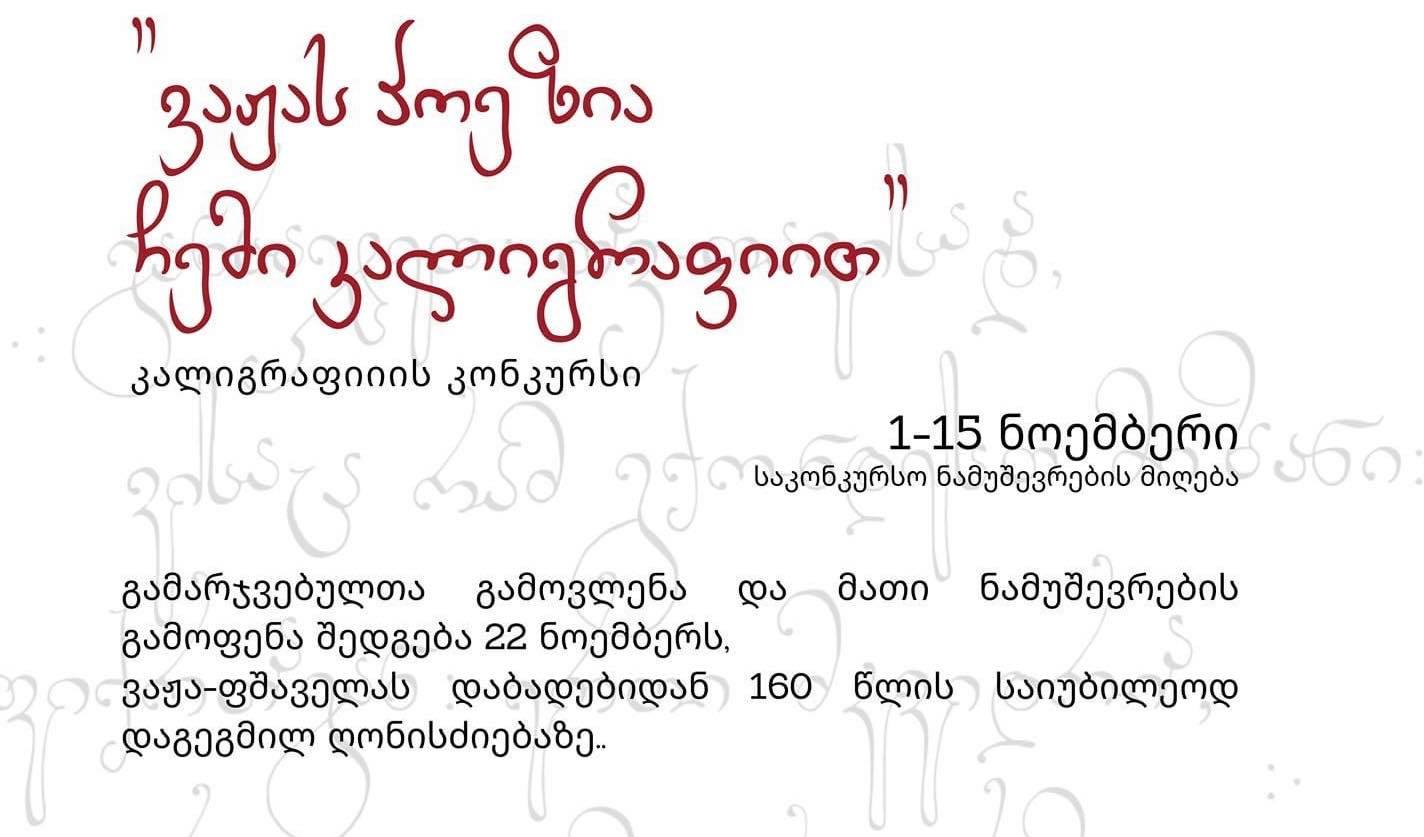 ხელნაწერთა ეროვნული ცენტრი, ფონდ “დიასპორების ალიანსთან” თანამშრომლობით, კალიგრაფიის მოყვარულებისთვის აცხადებს კონკურსს “ვაჟას პოეზია ჩემი კალიგრაფიით”.