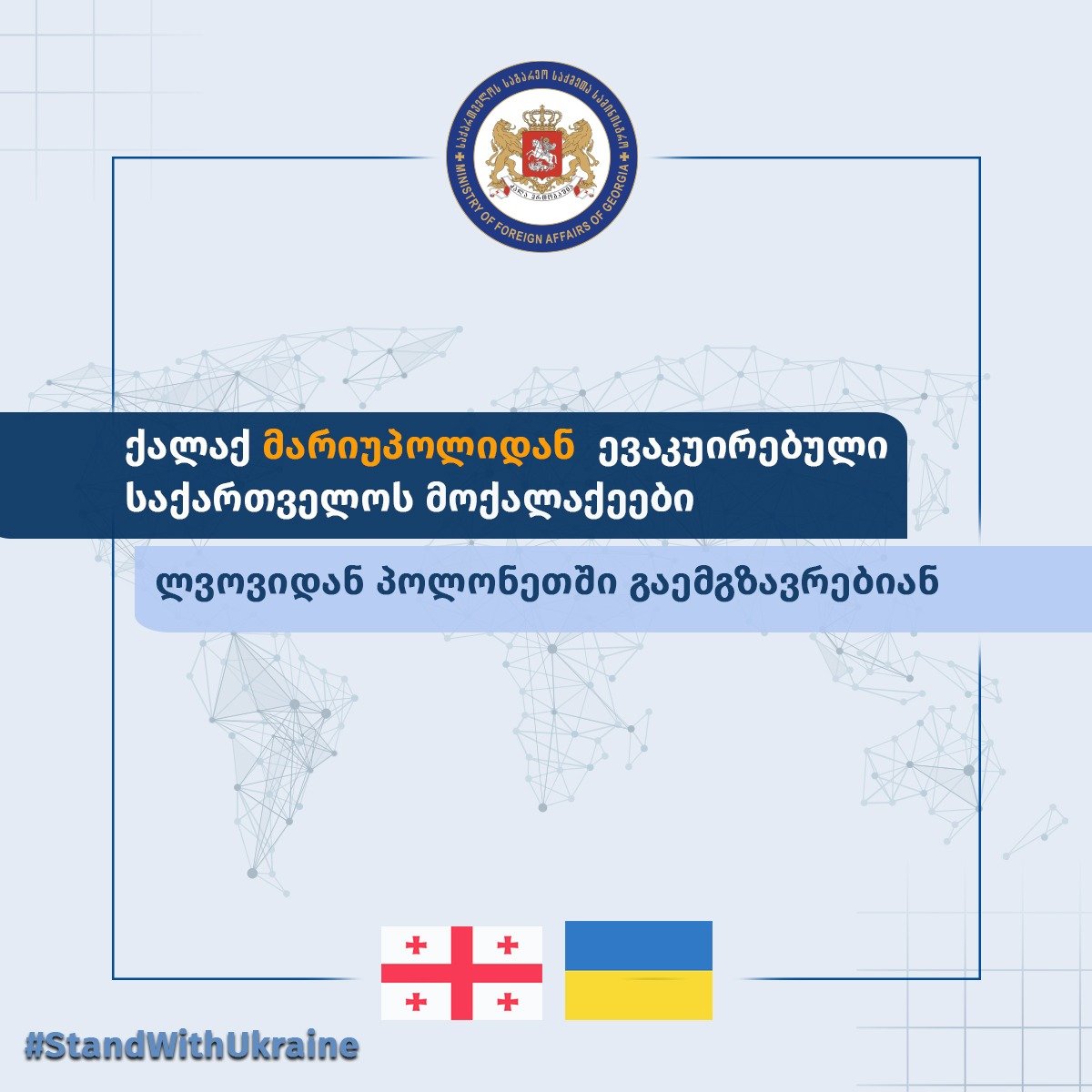 სახელმწიფო განაგრძობს უკრაინიდან ევაკუირებული საქართველოს მოქალაქეების სამშობლოში ორგანიზებულად დაბრუნების და ადგილზე მათი დახმარების პროცესს. დღეს ქ. რივნოდან ქ. ლვოვის მიმართულებით ორგანიზებულად მოხდა ქ. მარიუპოლიდან ევაკუირებული საქართველოს მოქალაქეების გამოყვანა, საიდანაც ისინი უკვე პოლონეთის მიმართულებით, კერძოდ ქ. ვარშავაში გაემგზავრებიან.