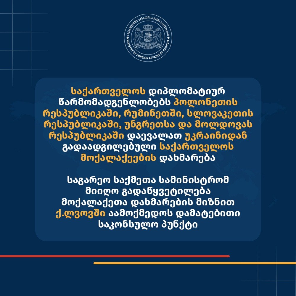 🇬🇪🇺🇦 უკრაინაში განვითარებულ საომარ მდგომარეობასთან დაკავშირებით, საქართველოს დიპლომატიური მისიები ქ. კიევსა და ქ. ოდესაში აგრძელებენ საგანგებო, 24 საათიან რეჟიმში მუშაობას და ქმედით დახმარებას უწევენ საქართველოს მოქალაქეებს უკრაინის ტერიტორიის დატოვების და ჰუმანიტარული კუთხით. მოქალაქეების გადაადგილებისა და კონცენტრაციის გათვალისწინებით, საგარეო საქმეთა სამინისტრომ მიიღო გადაწყვეტილება მოქალაქეთა დახმარების მიზნით ქ. ლვოვში აამოქმედოს დამატებითი საკონსულო პუნქტი.