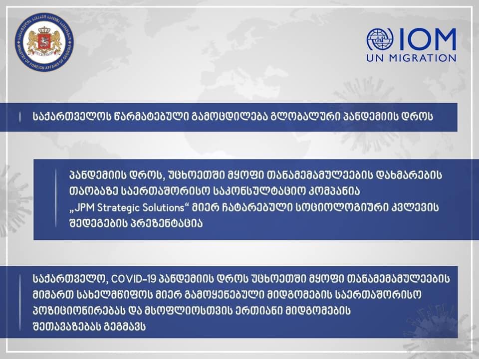 მიმდინარე წლის 11 სექტემბერს საქართველოს საგარეო საქმეთა სამინისტრო საერთაშორისო საკონსულტაციო კომპანია „JPM Strategic Solutions“ მიერ ჩატარებული სოციოლოგიური კვლევის შედეგების პრეზენტაციას გამართავს. კვლევა COVID-19 პანდემიის კრიზისულ პერიოდში უცხოეთში მყოფი თანამემამულეების საჭიროებებზე რეაგირებისა და მათი დახმარების მიზნით სახელმწიფოს მიერ გადადგმულ ნაბიჯებს ეხება და წარმოგვიდგენს, როგორც ეროვნულ დონეზე, ასევე უშუალოდ ბენეფიციართა უკუკავშირს გაწეული საქმიანობის საჭიროებასა და მიზანშეწონილობაზე.