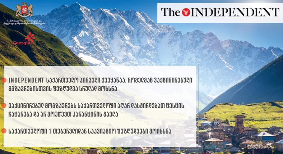 „საქართველო პირველი ქვეყანაა, რომელმაც ვაქცინირებული მგზავრებისთვის შეზღუდვა სრულად მოხსნა“ - წერს ბრიტანული გამოცემა Independent.