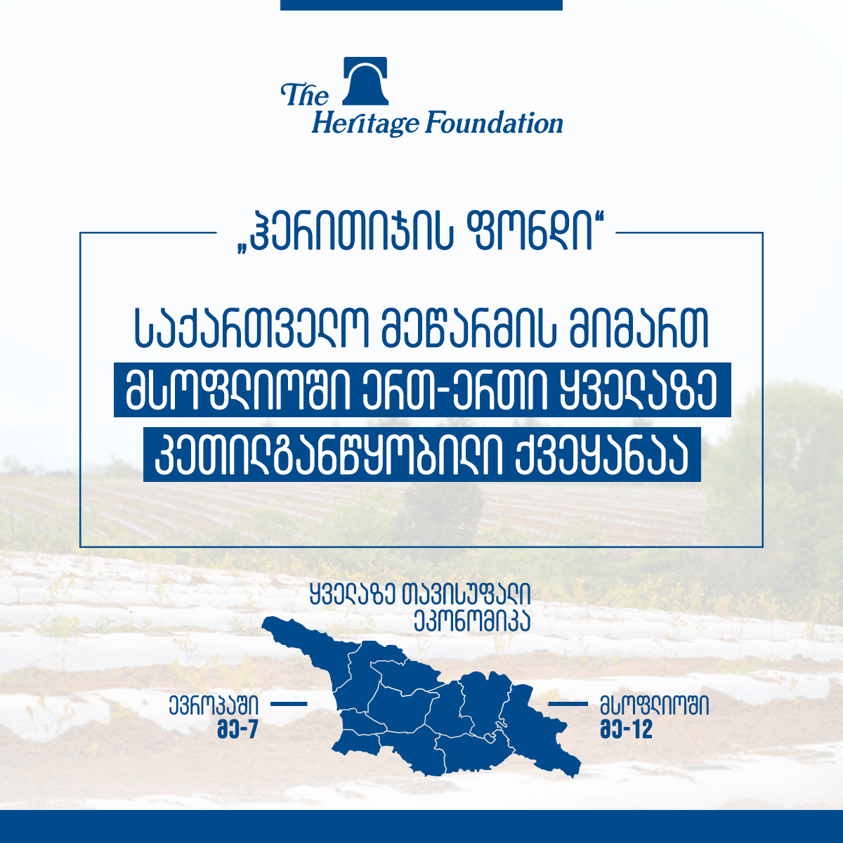 ანგარიშის თანახმად, საქართველოს ეკონომიკამ შეძლო მიმდინარე წელს დაფიქსირებული მინიმალური უკუსვლის გადალახვა და წინსვლის უზრუნველყოფაც. ანგარიშში აღნიშნულია, რომ მრავალწლიანი რეფორმების შედეგად, შესაძლებელი გახდა კორუფციის დონის შემცირება, რეგულაციების შესუსტება და გადასახადების გამარტივება, ხოლო ყოველივე ამან უზრუნველყო ქვეყნის წინსვლა ეკონომიკური თავისუფლების ყველა ასპექტში.