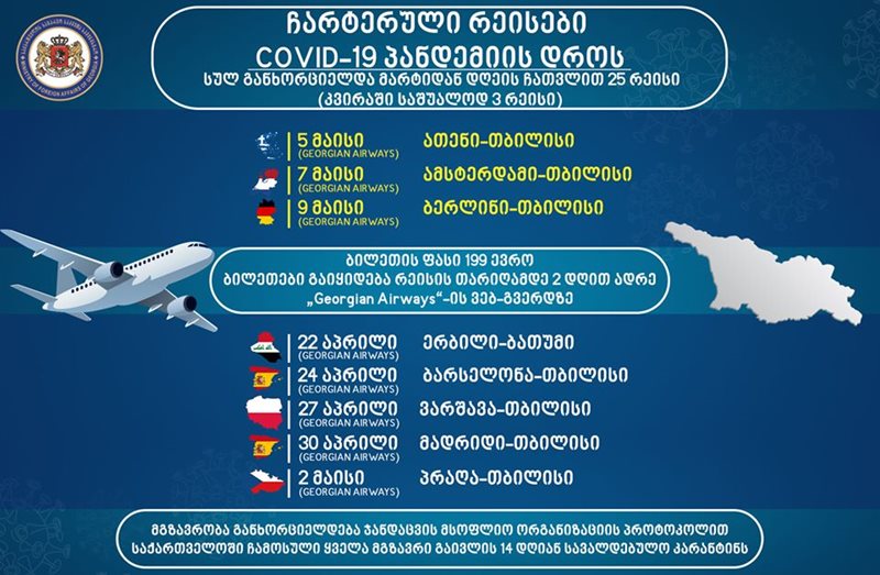 უცხოეთში მყოფი საქართველოს მოქალაქეების სამშობლოში ეტაპობრივი და ორგანიზებული დაბრუნების მიზნით, საკოორდინაციო საბჭოს დავალებით, ევროპიდან საქართველოს მიმართულებით რეისებს კომპანია “Georgian Airways” ახორციელებს. საბჭოსვე მითითებით, ყველა ასეთ რეისზე ბილეთის ფასი არის 199 ევრო. აღნიშნული რეისები სრულდება ჯანდაცვის მსოფლიო ორგანიზაციის წესის სრული დაცვით და ყველა მგზავრი, რომელიც ჩამოდის საქართველოში, გადის 14-დღიან სავალდებულო კარანტინს.
