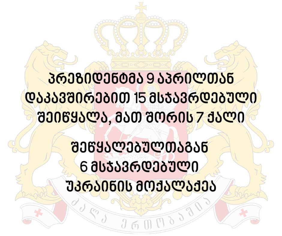 საქართველოს პრეზიდენტმა 9 აპრილთან დაკავშირებით შეწყალების აქტი გამოსცა და 15 მსჯავრდებული შეიწყალა, მათ შორის 7 ქალი, რომლებიც პენიტენციურ დაწესებულებებს დღეს, 9 აპრილს დატოვებენ.