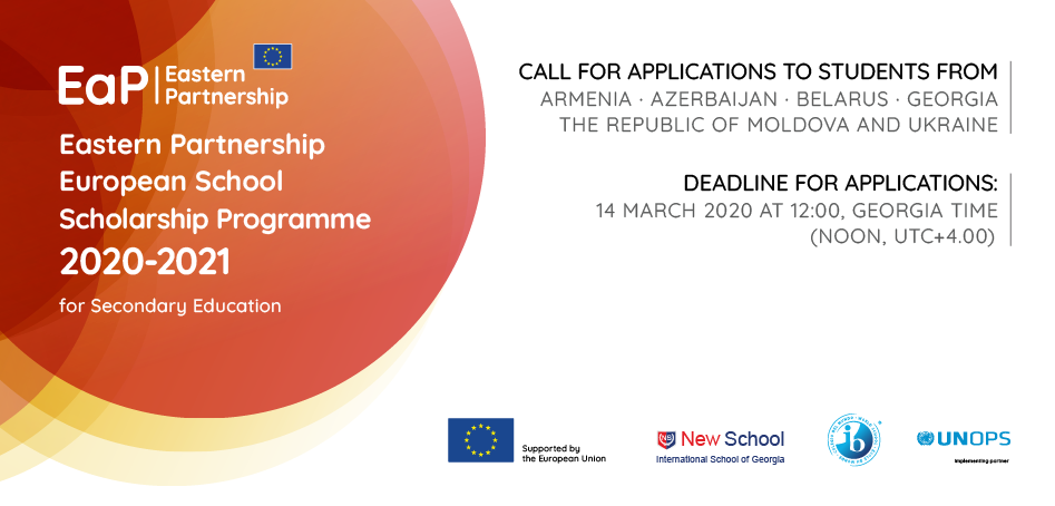 თბილისში არსებული „ახალი სკოლა“, ევროკავშირისა (EU) და საერთაშორისო ბაკალავრიატის ორგანიზაციის (IB) მხარდაჭერით, აცხადებს კონკურსს სტიპენდიების მისაღებად 2020-2021 სასწავლო წელს ევროპამცოდნეობის საერთაშორისო ბაკალავრიატის სადიპლომო პროგრამაზე სასწავლებლად. კონკურსში მონაწილეობა შეუძლიათ 16-17 წლის მოსწავლეებს „აღმოსავლეთ პარტნიორობის“ წევრი ქვეყნებიდან: აზერბაიჯანიდან, ბელარუსიდან, მოლდოვის რესპუბლიკიდან, საქართველოდან, სომხეთიდან და უკრაინიდან. განაცხადების მიღების ბოლო ვადაა 2020 წლის 14 მარტი, 12:00 სთ. (თბილისის დროით).