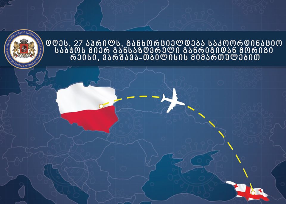 საქართველოს ხელისუფლება განაგრძობს უცხოეთში მყოფი მოქალაქეების სამშობლოში ეტაპობრივი და ორგანიზებული დაბრუნების პროცესს. დღეს, 27 აპრილს, გეგმიური რეისების ფარგლებში შესრულდება ფრენა ვარშავა-თბილისის მიმართულებით.