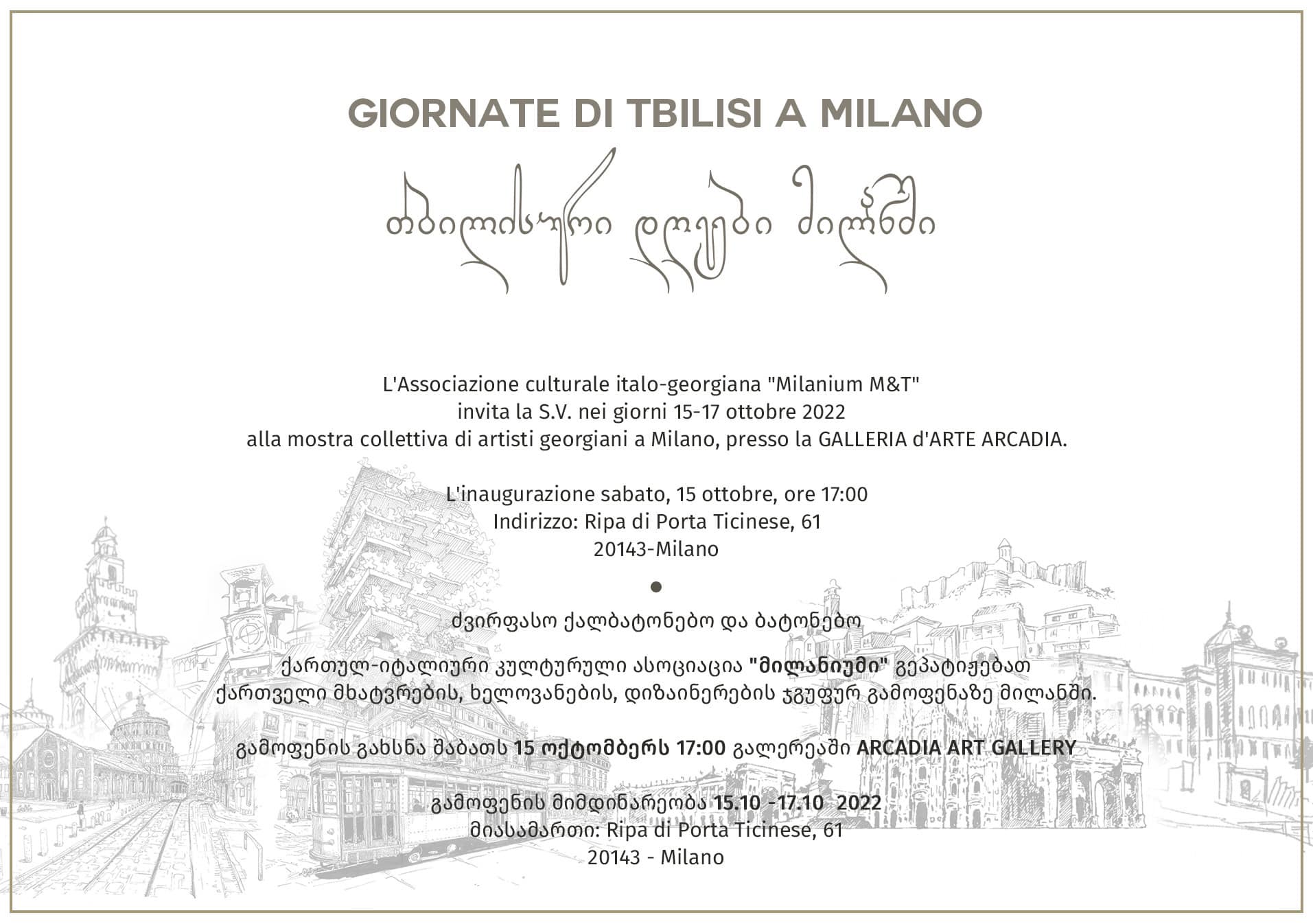 ასოციაცია “მილანიუმი” 15-17 ოქტომბერს გამართავს გამოფენას. აღნიშნულლი ღონისძიება “დიასპორული ინიციატივების ხელშეწყობის” ფარგლებში გამარჯვებული პროექტის - “თბილისური დღეები მილანში” - ფარგლებში ხორციელდება.