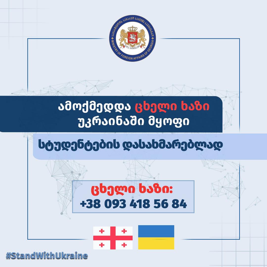ამასთან, საქართველოს მოქალაქე, უკრაინაში მყოფმა სტუდენტებმა, საკუთარი მონაცემები შეუძლიათ ასევე გადასცენ საქართველოს დიპლომატიურ წარმომადგენლობას შემდეგ ნომრებზე: